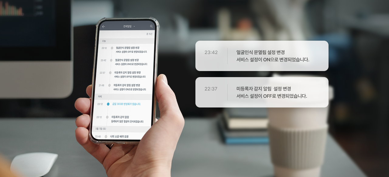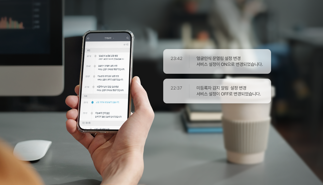 Unauthorized door openings or unusual movement is detected and video-recorded automatically. Notification sent immediately to both security office and your Smartphone directly.